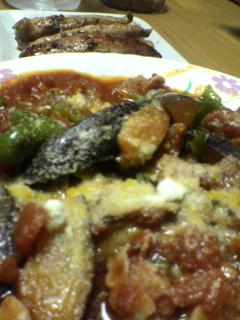 めずらしく夫が作る晩御飯。ホントは、トマトソース作って、茄子を縦にスライスしてチーズと茄子とソースを交互に重ねてオーブンで焼くものを作ろうと思っていたんだけどね…。
