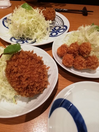 夫はヒレカツ単品。私は、おつまみチーズ串とカニと胡瓜のサラダにしようとしたら、サラダは品切れとのことで、黒豚メンチカツを1つ。あと、ウーロンハイ。